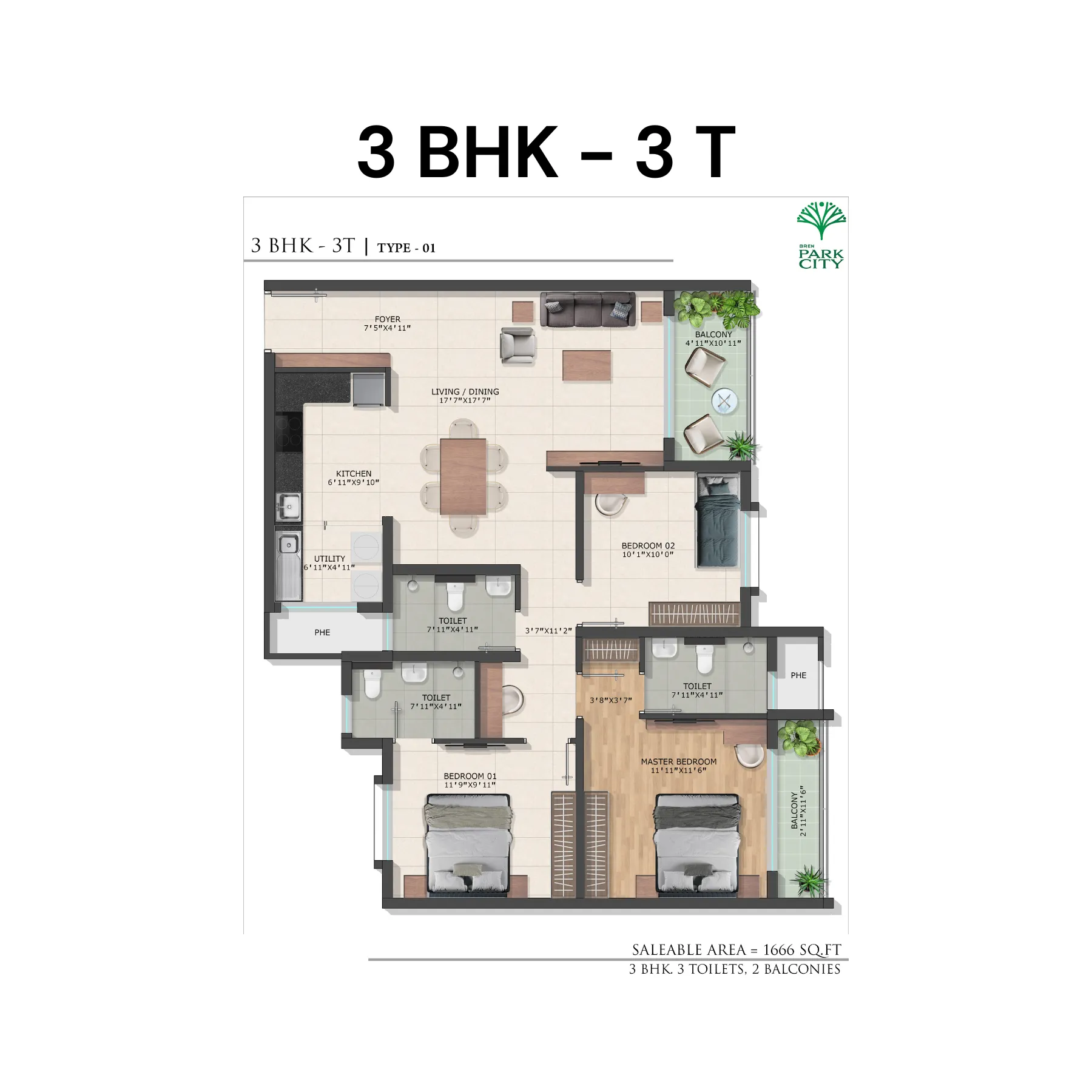 • 3 BHK + 2 Toilets: 1590 – 1605 sq.ft