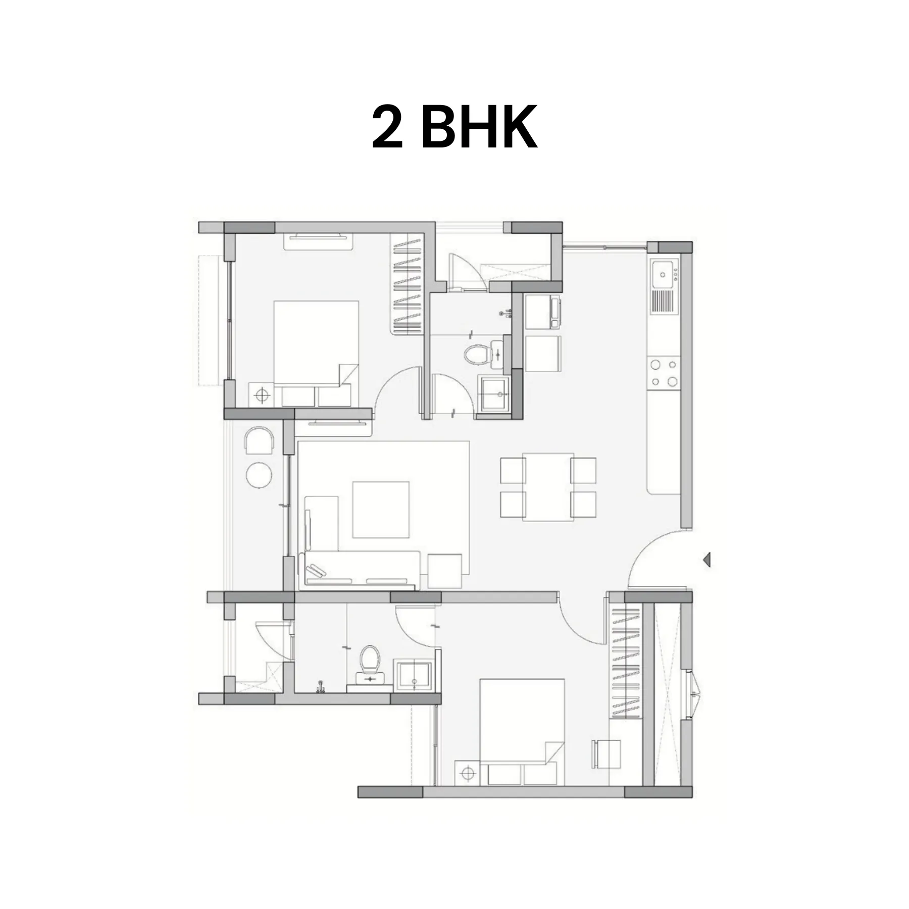 The 2 BHK apartments at Cumins Sanctum are thoughtfully planned for young families, couples, and professionals seeking a compact yet comfortable living space in a prime North Bangalore location. The layout features a well-defined living and dining area that maximizes usable space while maintaining a sense of openness. The kitchen is efficiently designed with adequate storage and workflow, making everyday cooking convenient. Both bedrooms are proportioned to allow comfortable furniture placement, natural light, and proper ventilation, ensuring a pleasant indoor environment throughout the day. The master bedroom offers privacy and functionality, while the second bedroom can easily serve as a guest room or children’s room. This configuration is ideal for buyers looking for a low-maintenance home that balances practicality, comfort, and long-term value within a peaceful, wellness-focused residential community.